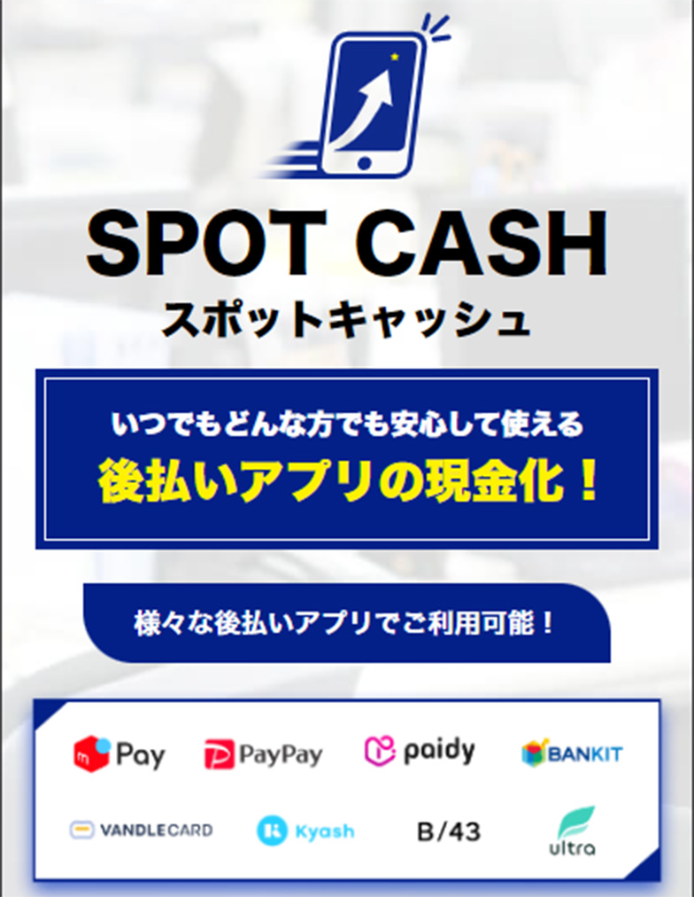 スポットキャッシュでは、数多くの後払い決済機能がついたアプリで現金化サービス利用可能な上、最短10分で取引が完了するスピード対応 が特徴の現金化業者となります。また借金は異なる現金調達方法になるので、安心してご利用いただけます。